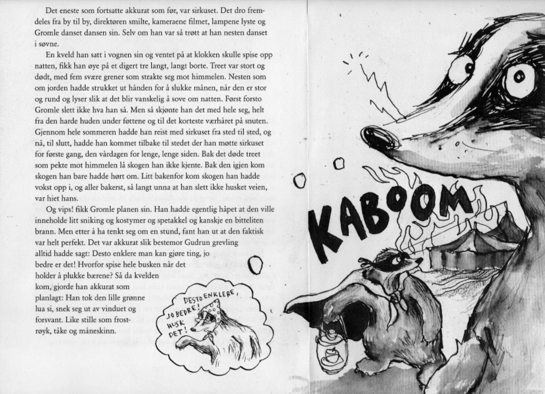 Og vips! fikk Gromle planen sin. Han hadde egentlig håpet at den ville inneholde litt sniking og kostymer og spetakkel og kanskje en bitteliten brann. Men etter å ha tenkt seg om en stund, fant han ut at den faktisk var helt perfekt. Det var akkurat som bestemor Gudrun grevling alltid hadde sagt: Desto enklere du kan gjøre ting, jo bedre er det. Hvorfor spise hele busken, når det holder å plukke bærene? Så da kvelden kom gjorde han akkurat som planlagt: Han tok den lille grønne lua si, snek seg ut av vinduet og forsvant. Like stille som frostrøyk, tåke og måneskinn.
